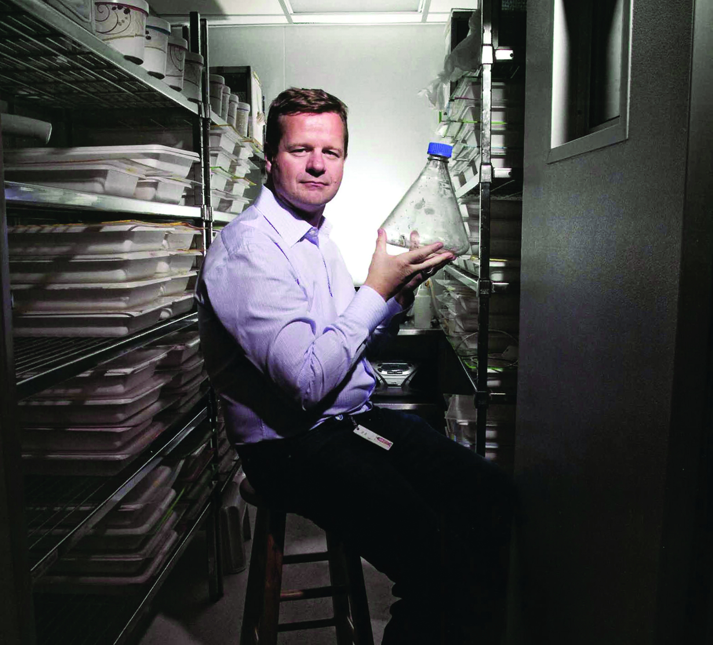 Stefan Kappe holds a bottle of mosquitoes in the mosquito room, which also houses larvae in trays. Photo courtesy of Center for Infectious Diseases Research
